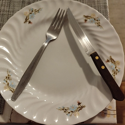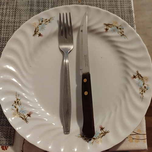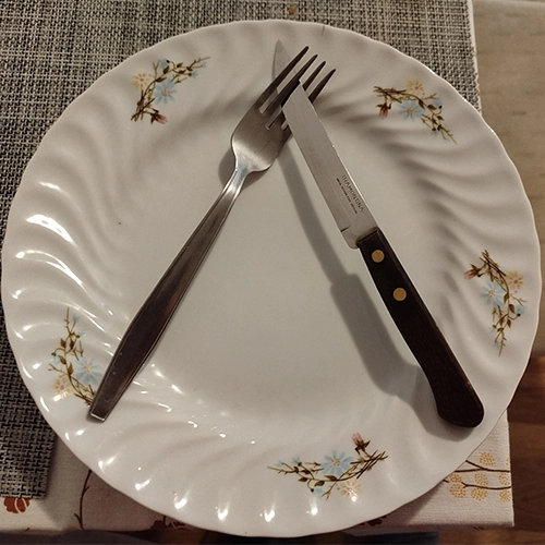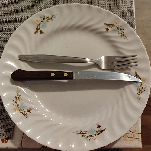 - Párhuzamos kés + villa, de kicsit „készenléti” hatással: egymás mellett, rendezetten a tányéron.