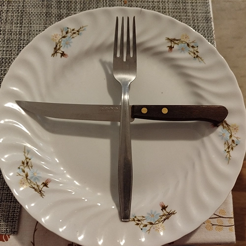 - Egyes hagyományokban a keresztbe tett evőeszköz vagy a kés „átfektetése” a villa fogain át jelezhet negatív üzenetet, de ez nem egységes, könnyű félreérteni.