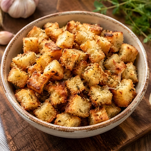 5) “Szikkadt kifli” fokhagymás sajtos kruton serpenyőben (levesre/salátára)