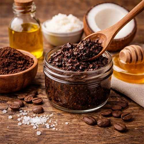 - kávézacc + kevés olaj (olíva/kókusz) + opcionálisan méz