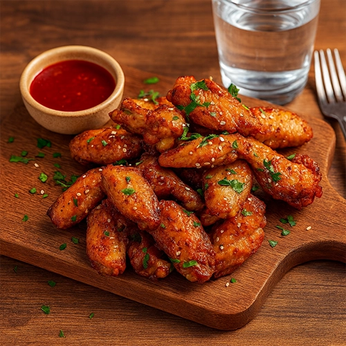 Ha igazi, aranybarnára sült, kívül ropogós csirkeszárny, belül szaftos csirkeszárnyra vágysz, a szezámmaggal koronázott változat lesz a kedvenced. Ez a recept mindössze néhány hétköznapi alapanyagot használ, mégis éttermi élményt ad: a fokhagymával illatosított olívaolaj, a pikáns ketchup, a szójaszósz és a frissen facsart narancslé együtt lágyan karamellizálódó mázzá áll össze a sütőben. A szezámmag a végén finom roppanást ad, a friss petrezselyem pedig üde pontot tesz az ízek végére. Tökéletes villámvacsora vagy baráti filmezés mellé, minimális előkészítéssel és maximális élvezettel. A siker titka a gondos előkészítés: a csirkeszárnyak legyenek alaposan szárazra törölve, így a bőr feszesen pirul, és nem párolódik. A rövid, 30 perces pihentetés segít, hogy a fűszeres, enyhén édeskés máz a hús felületébe tapadjon, sütés közben pedig látványos, fényes bevonatot kapjon. A légkeverés és a magas hő garantálja a roppanást; érdemes félidőben megforgatni a szárnyakat, hogy minden oldal egyenletesen süljön, a bőr pedig extrán kérgesedjen.Az eredmény illatos, ragyogóan mázas csirkeszárny, amelyet frissen pirított szezámmaggal szórunk meg, és finomra vágott petrezselyemmel fejezünk be. Tálald ropogós salátával, sült zöldséggel vagy egyszerű párolt rizzsel; a selymes máz a köretet is kellemesen bevonja. Ha még több ropogást szeretnél, az utolsó percekben kapcsold a sütőt grillfokozatra. A recept kezdőknek is biztos siker, könnyen skálázható nagyobb társaságra, és egész évben bevethető – hétköznapokon ugyanúgy, mint egy laza, közös filmnézés vagy meccsnézés kísérőjeként.