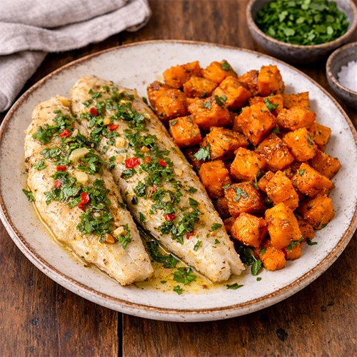 Pikáns sügérfilé, sült édesburgonyával tálalva – egészséges élvezet!
