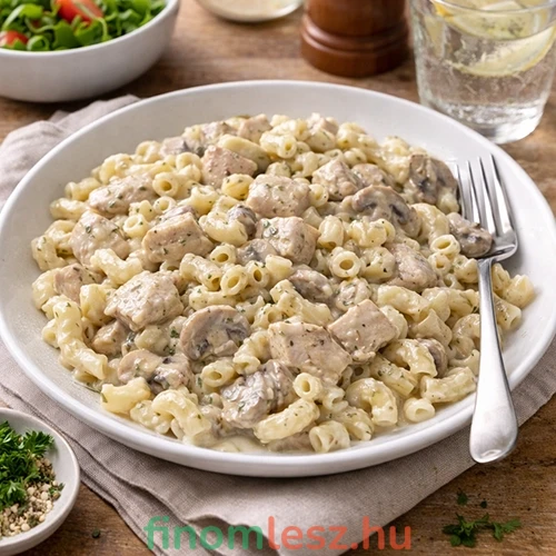 Tárkonyos tejfölös gombás csirkeragu szarvacska tésztával