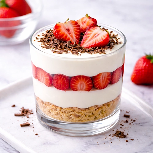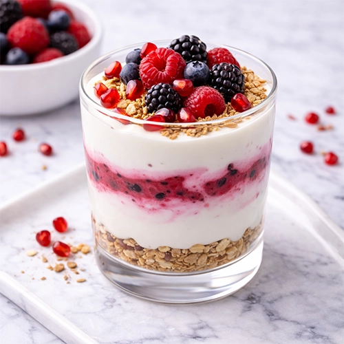 - Rétegezd pohárba: joghurt → gyümölcs → joghurt → granola.